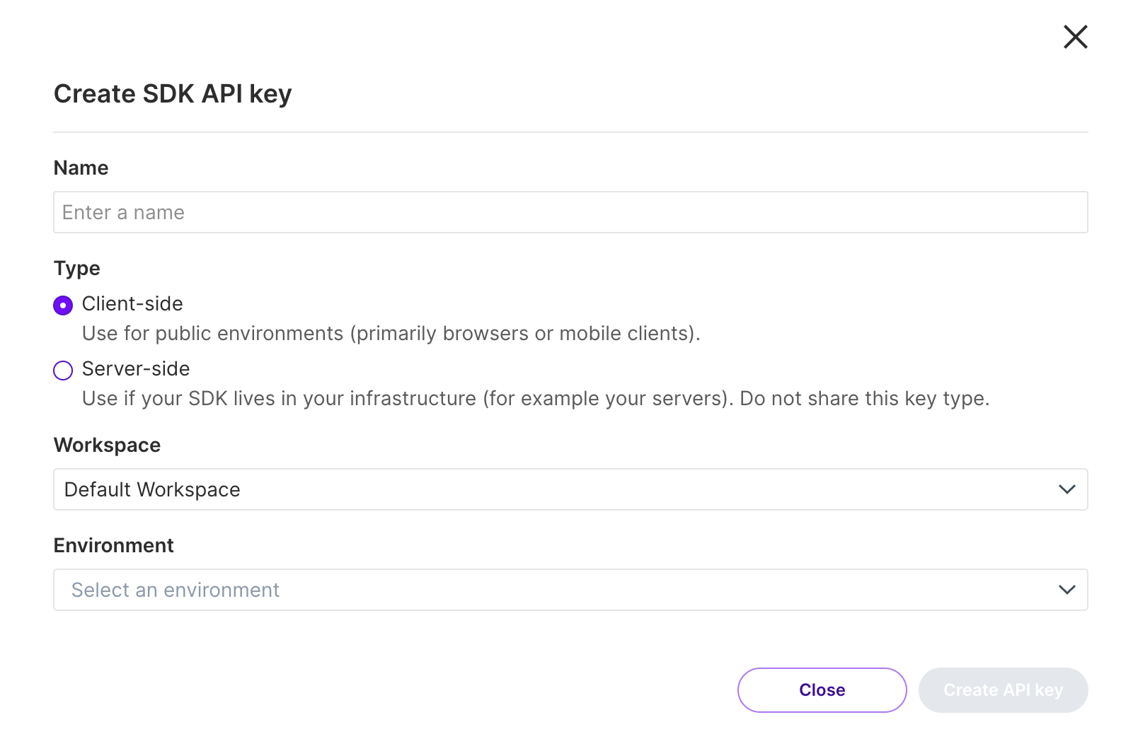 Client-side type API keys are for SDKs living in public environments (for example, browsers or mobile clients)