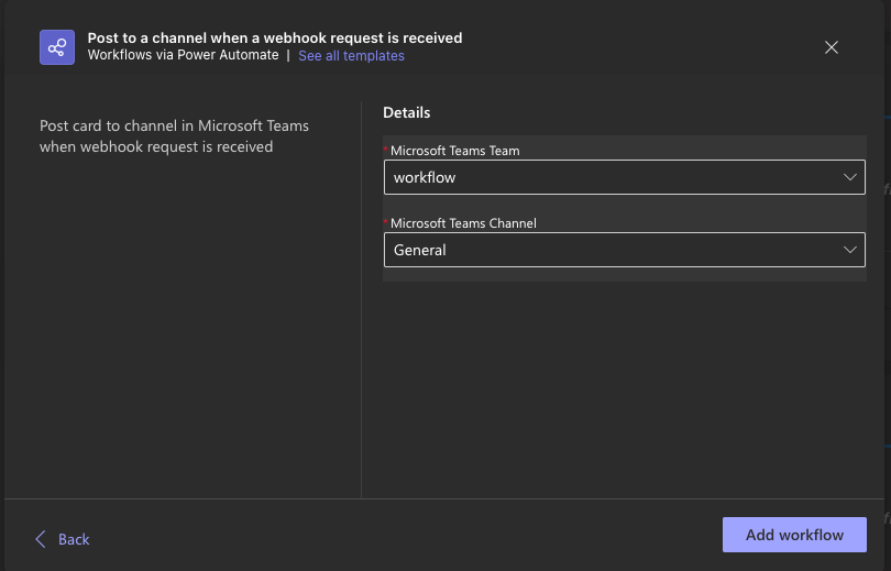 - Select the Team and Channel where you’d like to receive notifications, then click Add Workflow.