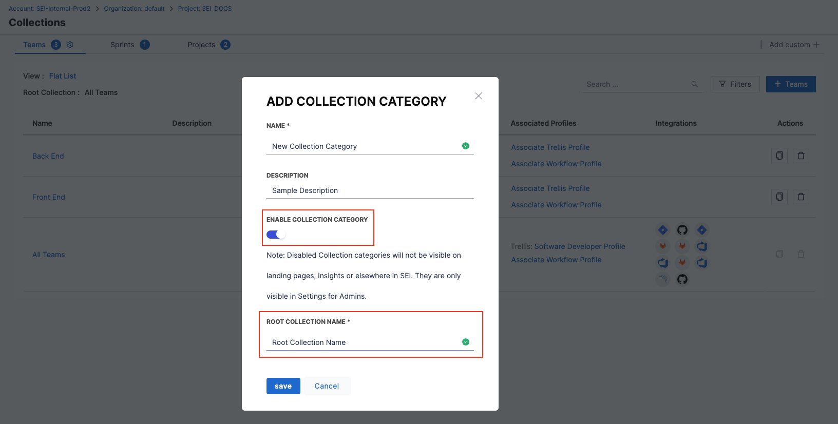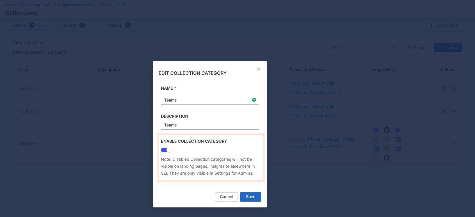 - Enable or disable the Collection category. Disabled categories are not visible on landing pages, Insights, or elsewhere in SEI, except on the Collection Settings page for SEI Admin users.